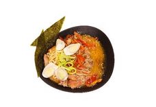 380 г • Свинина, перец болгарский, морковь, бекон, мисо паста, хондаши, лапша, яйцо отварное, лук порей, нори, кунжут.