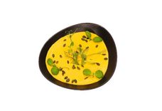 250 г • Тыква, морковь, сливки, перец черный, чеснок, соль, масло сливочное, кинза, тыквенный семечки.