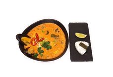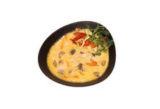 380 г • Креветка, кальмар, имбирь свежий, лук порей, лемонграс, грибы шампиньоны, кокосовое молоко, ким-чи, соевый соус, сок лайма, сливки, листья кафир лайма, мидии с панцирем, черри, кинза, рис, лук порей.